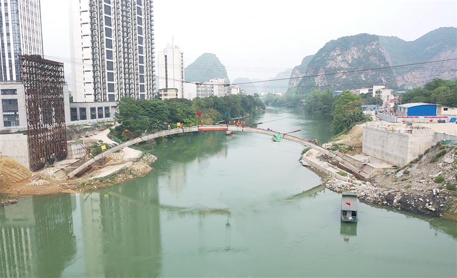 4月28日,桂金分公司承建的河池市龍江六橋(輝樂橋)首條拱肋合攏。冶建公司副總經(jīng)理、總工程師廖立波,副總經(jīng)理、安全總監(jiān)何勇到場指導。